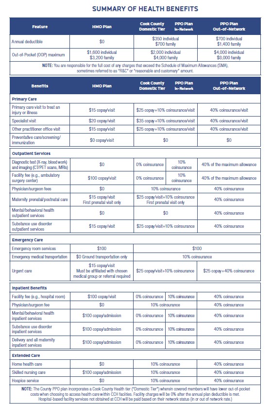 The County offers two medical benefit plans: Blue Advantage HMO and Blue Cross Blue Shield PPO. Please see plan details below.